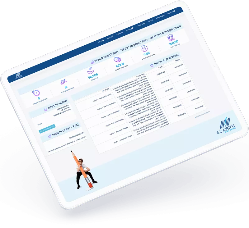 לנו באיזימץ’ יש ממשק לחלק ניכר מתוכנות הקופות בישראל, מהן אנו מקבלים ישירות את נתוני הקבלות שלכם בבית העסק.
