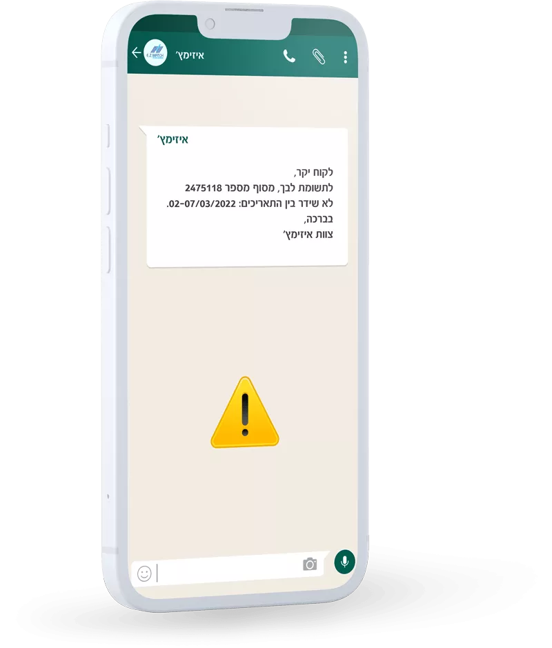 אנחנו נדע לזהות ולהתריע בפניכם עוד לפני שתזהו זאת בעצמכם ע"י שליחת הודעת SMS / WhatsApp ישירות לנייד או כדו"ח למייל.