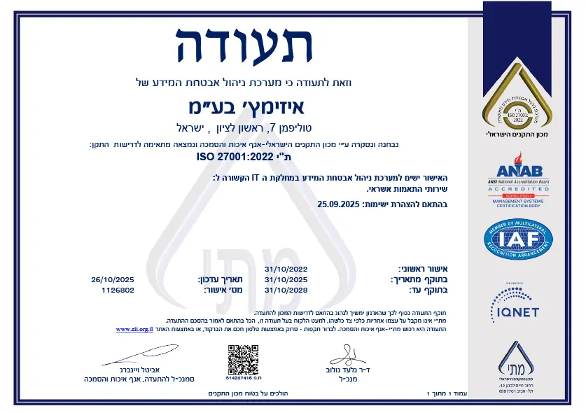 תקן אבטחת מידע ISO 27001 הינו תקן בינלאומי, אשר בודק את מדיניות החברה בנושא אבטחת מידע בארגון.